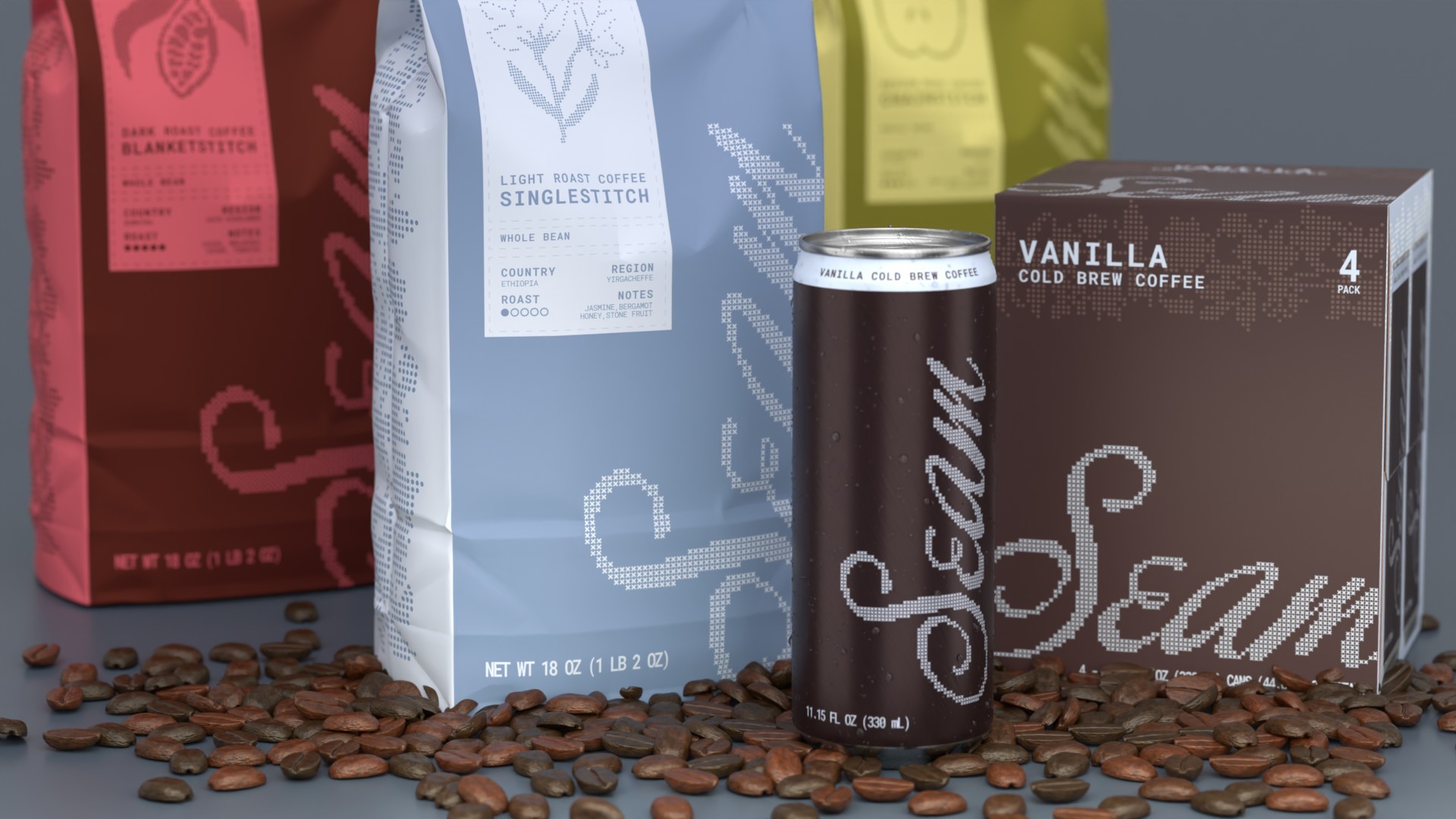 The Seam coffee line spans five products: three whole bean bags, a single cold brew can, and a four-pack cold brew box, unified by a consistent cross-stitch-inspired design system.